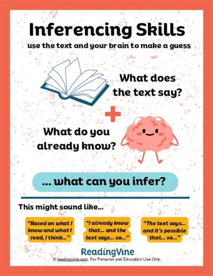 Making an inference involves using what you know to make a guess about what you don’t know or reading between the lines. Readers who make inferences use the clues in the text along with their own experiences to help them figure out what is not directly said, making the text personal and memorable.