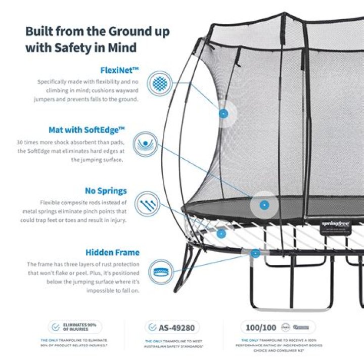 By minimizing the risk of impact with the steel frame as well as eliminating dangerous springs, springless trampolines are worth the money just in the emergency room visits avoided. Every year there are over 100,000 trampoline related injuries, and 93% of all broken bones from trampoline injuries are to young kids.