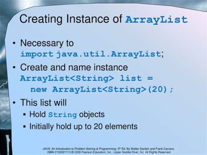 An ArrayList is an object that can store a group of other objects for us and allow us to manipulate those objects one by one. For example, we could use an ArrayList to store all the String names of the pizza toppings offered by a restaurant, or we could store all the URLs that make up a user’s favorite sites.