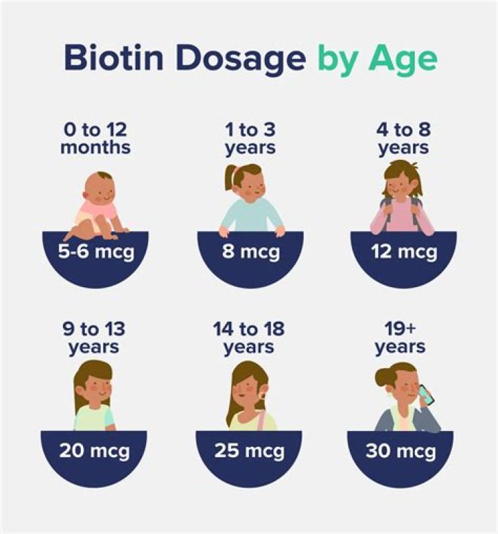Infants and toddlers ages 3 and under need 10-20 micrograms (mcg) of biotin each day. Children ages 4 to 6 need 25 mcg of biotin each day. Children ages 7 to 10 need 30 mcg of biotin each day. Adolescents over the age of 10 need at least 30 mcg and no more than 100 mcg of biotin each day.