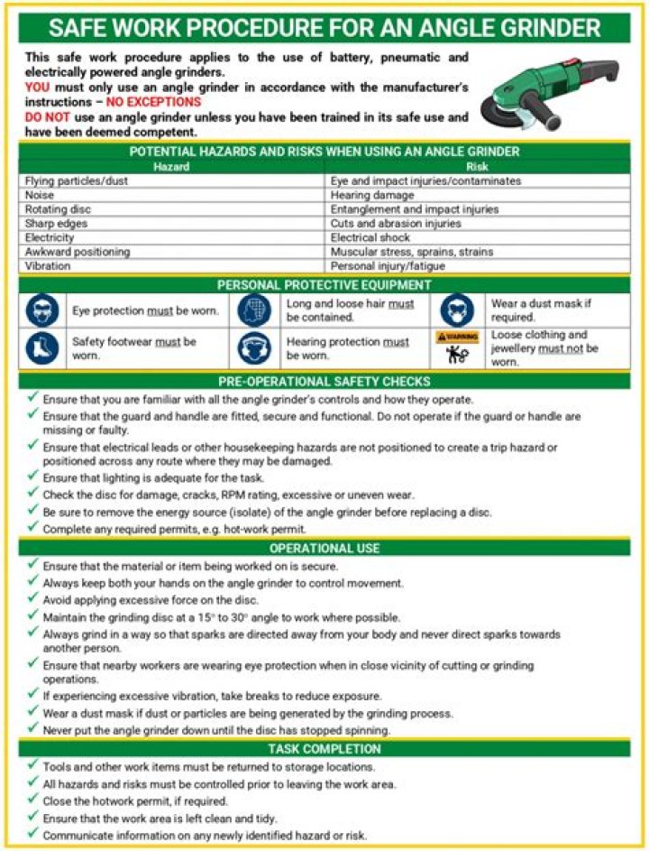Keep hands clear of work piece and away from disc. Turn off grinder at power point before changing the disc. Ensure guarding is in place before re-starting grinder. Ensure machines have been isolated from power sources before being cleaned, adjusted, maintained or repaired.