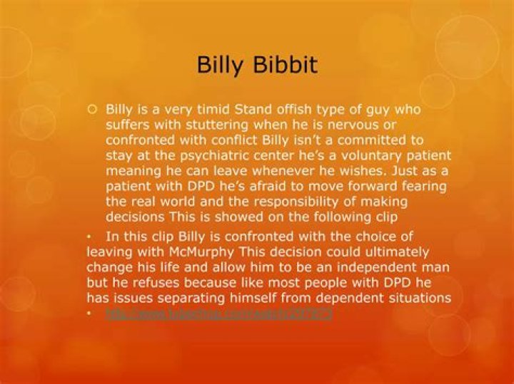 Billy Bibbit is a 31-year-old patient with a stutter. He is extremely close to his mother, and there is some indication that she may have an inappropriate sexual attraction to her son. Billy stutters as a result of his psychological issues.