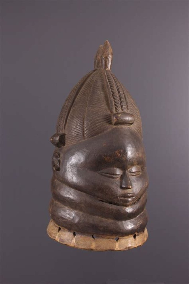 Worn at performances to celebrate the completion of the young initiates’ training period, these masks are finely carved to convey admired feminine features: an elaborate coiffure, a smooth broad forehead, narrowly slit eyes, a small composed mouth, and a sensuously ringed neck.