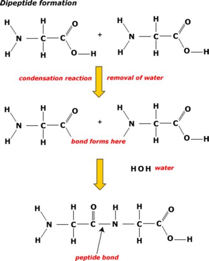 When two amino acids are joined together, a dipeptide is formed. A process called dehydration synthesis is used to join amino acids by forming a peptide bond. During this process, a molecule of water (H2O) is removed (dehydration) in order to synthesize a dipeptide.
