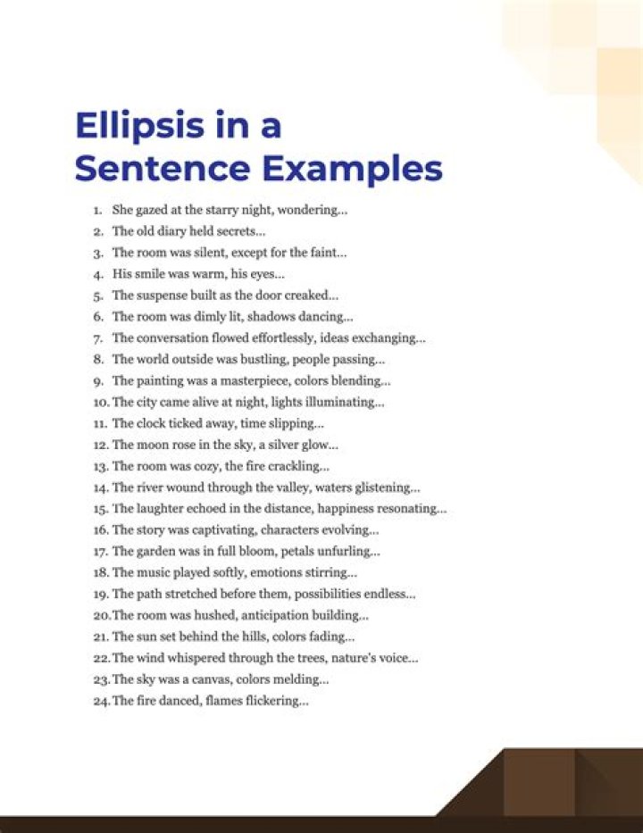An ellipsis has different purposes and can be very useful in your writing. It can be used to show a word or words have been removed from a quote. It can create suspense by adding a pause before the end of the sentence. It can also be used to show the trailing off of a thought.