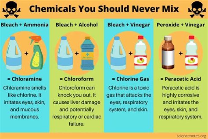 Bleach and Ammonia = Toxic Chloramine Vapor. Bleach and ammonia are two common household cleaners that should never be mixed. Bleach and rubbing alcohol = Toxic chloroform. Bleach and vinegar = Toxic Chlorine Gas. Vinegar and Peroxide = Paracetic Acid. Peroxide and Henna Hair Dye = Hair Nightmare.
