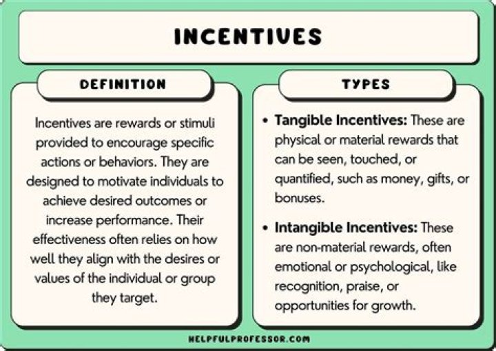 Incentive. An action, system, advertisement, belief, etc.. that is intended to change the behavior of another person (in other words, incentives attempt to get people to do something or not do something)