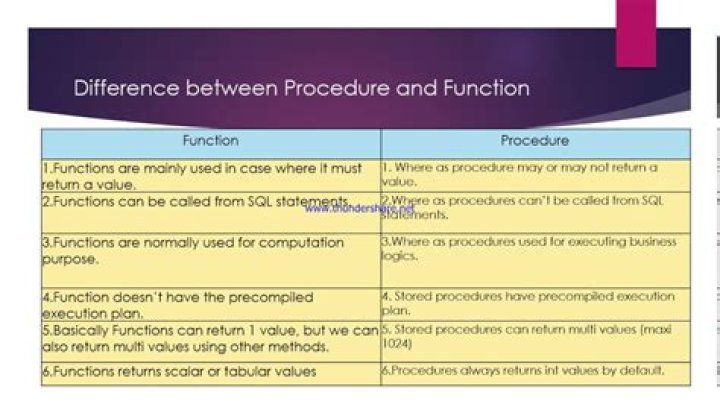 A function would return the returning value/control to the code or calling function. A procedure, on the other hand, would return the control, but would not return any value to the calling function or the code. We cannot use the DML statements in a function, (functions such as Update, Delete, and Insert).