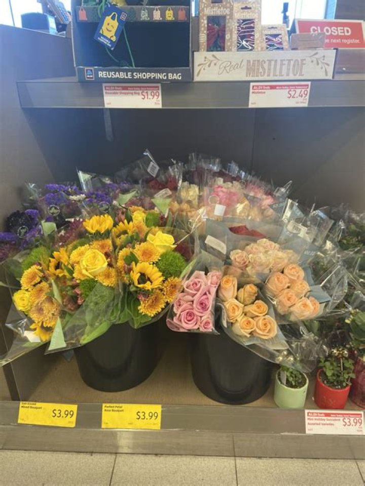 Aldi does not have a separate floral section, but you can find plants & flowers near the registers. Check Aldi finds every Wednesday to get more fresh flowers, plants, and seeds.
