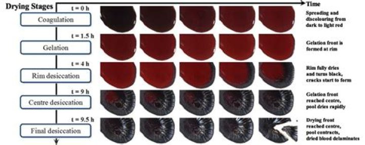Once bleeding occurs, blood being ex vivo, it will coagulate and dry. During the coagulation (clotting) process, fibrin strands are formed creating a solid structure of the blood, the clot. During drying water evaporates from the blood pool until only the solid matter, mainly red blood cells (RBC’s), remains.