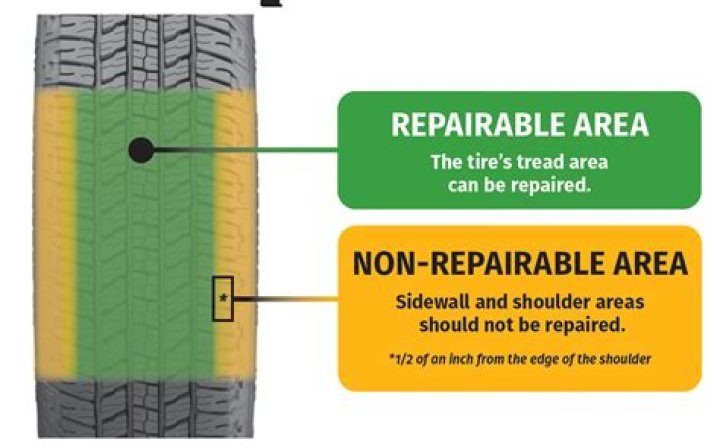 Puncture repairs are limited to the center of the tread area. If there are punctures or damage in the shoulder or sidewall of the tire, it is not repairable.