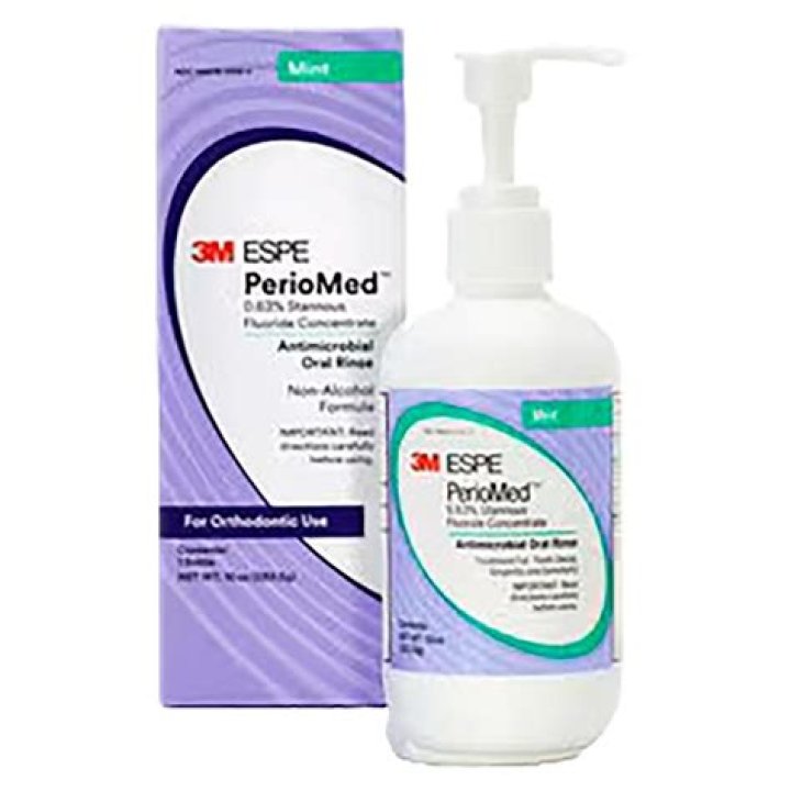 Periomed is a prescription stannous fluoride mouthwash that helps reduce cavities, treats swollen gums (gingivitis), prevents tooth sensitivity, and helps repair early stages of tooth decay.