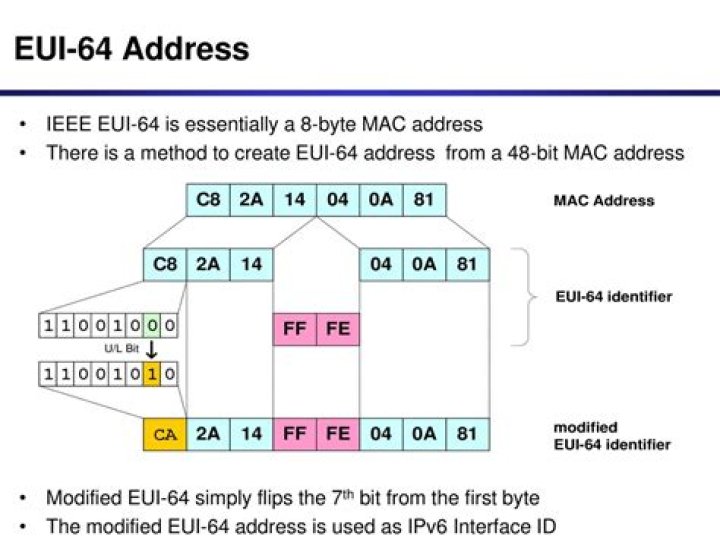Split the MAC address in two halves (6 hex digits each).Insert FFFE in between the two, making the interface ID.Invert the seventh bit of the interface ID.
