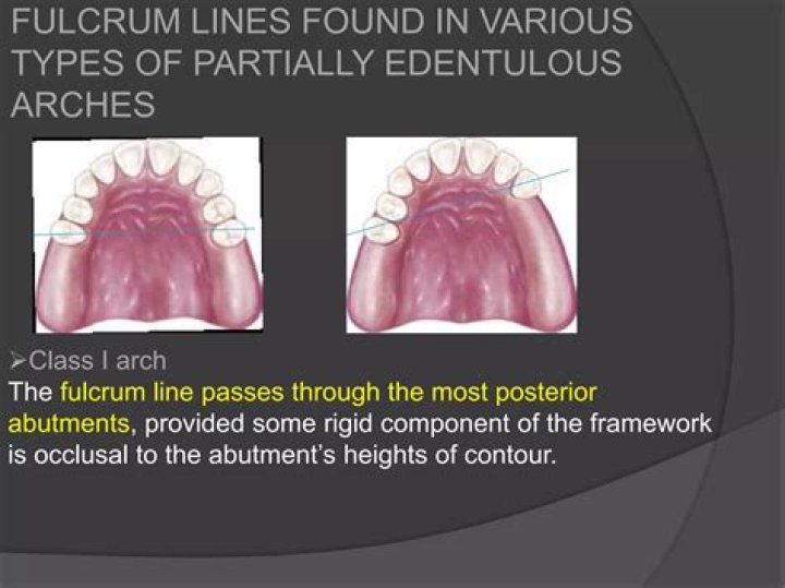 A fulcrum line is an imaginary line around which an RPD will tend to rotate. Fulcrum lines may be in the horizontal, frontal or vertical plane. Indirect retainers provide resistance to rotational movement of a distal extension RPD away from the denture bearing tissues around the retentive fulcrum line (Figure 2).