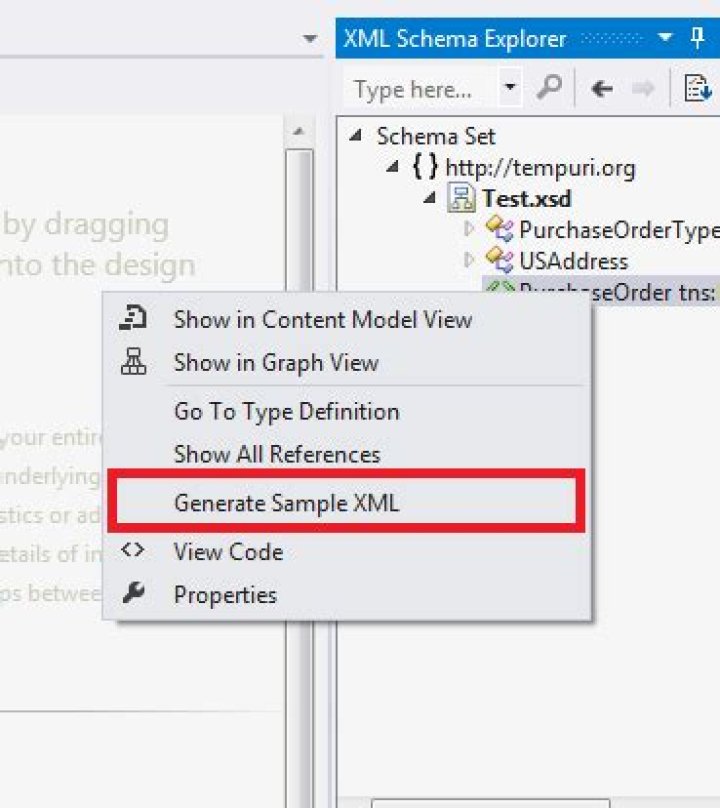 Open your XSD document.Switch to XML Schema Explorer.Right click the root node and choose “Generate Sample Xml”
