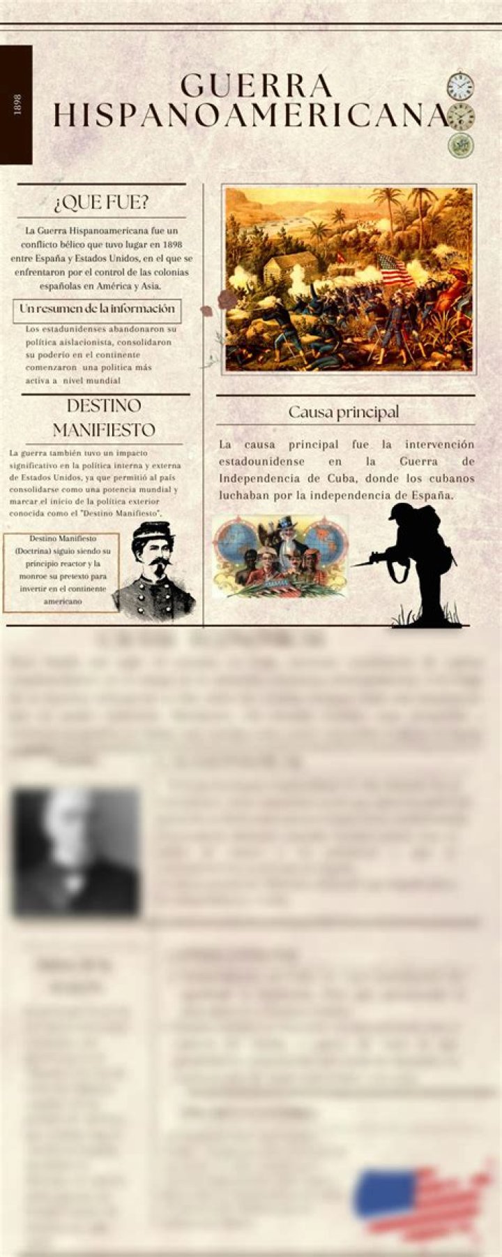 Esta guerra fue un conflicto armado entre dos de las superpotencias militares imperialistas de la época (España y Estados Unidos) luchando por el control de Cuba, Puerto Rico, Guam y las Islas Filipinas. Los Estados Unidos ganaron la guerra y, como consecuencia, tomaron control de los territorios ya mencionados.