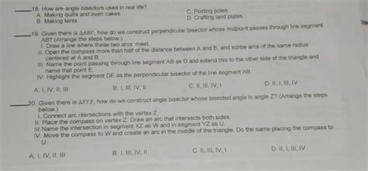 Which of the following statements describes an angle bisector of angle ABC? A B A line segment that divides angle ABC into The locus of points equidistant from both 2 equal parts sides AB and BC.