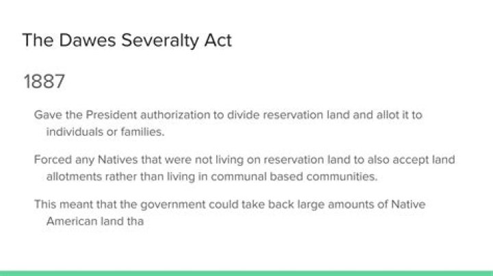 It destroyed the reservation system. Native Americans gained full citizenship- some settled to farming and were successful. Each male of the family recieved 160 acres of farming land or 320 of grazing land and after 25 years they have full ownership of land. You just studied 3 terms!