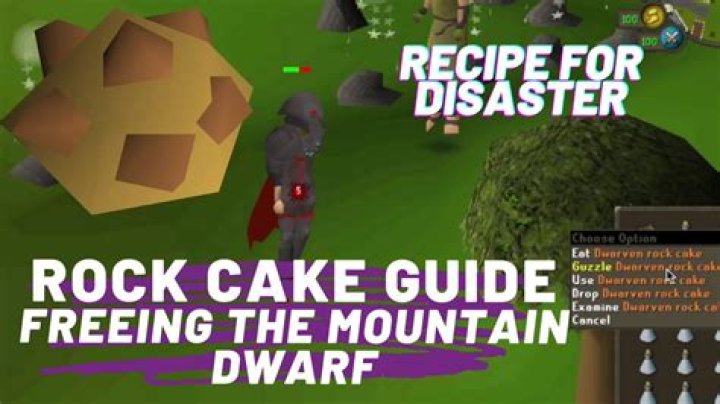 The dwarven rock cake is a quest item used in Freeing the Mountain dwarf in Recipe For Disaster. It can only be given to Rohak after it has been cooled, making a dwarven rock cake (cooled). Because of the small life point depletion, the rock cake can be seen occasionally used by people using the Dharok’s armour.