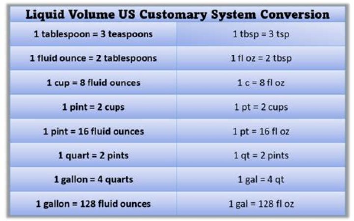 1 tablespoon = ½ fluid ounce.1 cup = ½ pint= 8 fluid ounces.2 cups = 1 pint = 16 fluid ounces.4 cups = 2 pints = 1 quart = 32 fluid ounces.16 cups = 8 pints = 1 gallon = 128 fluid ounces.