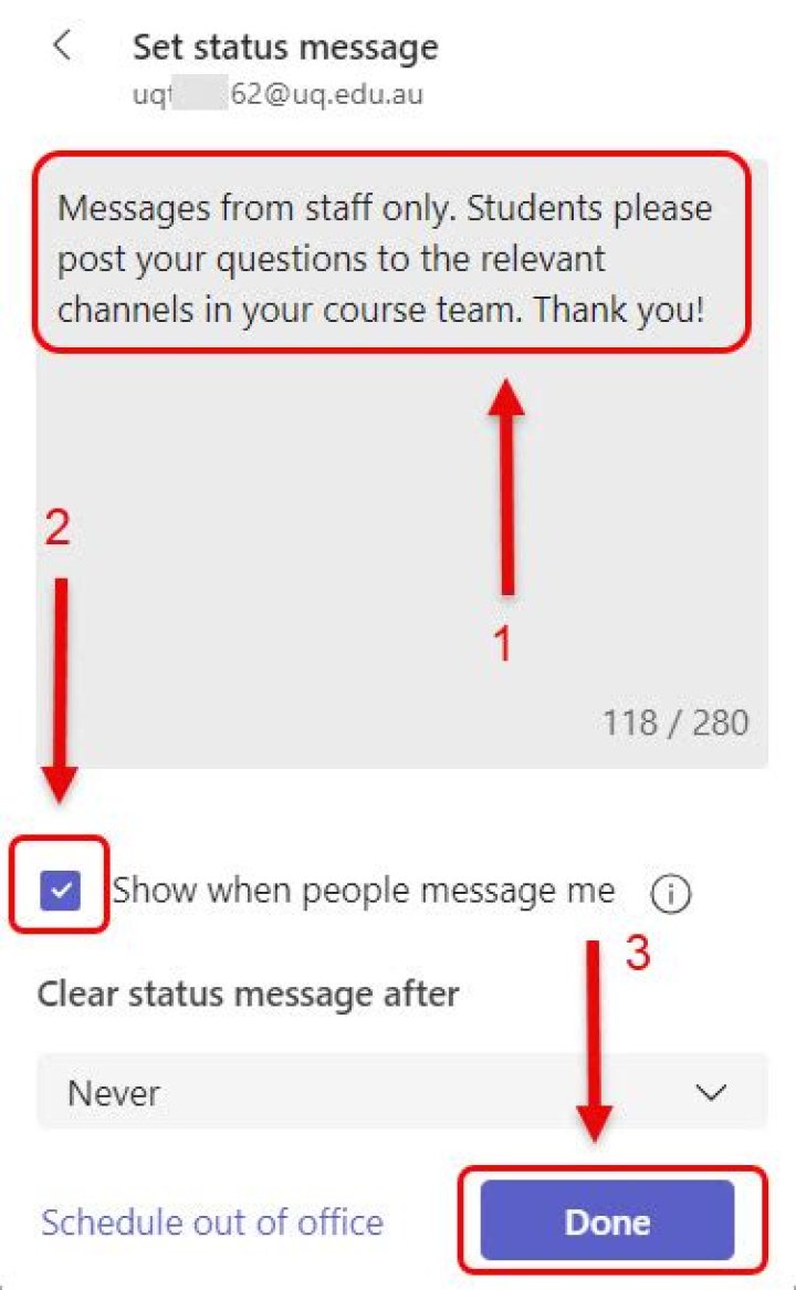 Click your photo, click Click to add status message, and then type a message, such as “In training today” or “Working on a deadline, please IM instead of stopping by.”