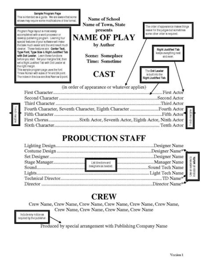 A cover design that reflects the play and its genre.Character descriptions (main/minor, protagonist/antagonist)Descriptions of costumes (can be represented visually)A labeled picture of the stage/set.A summary of the dramatic plot, without giving away the climax.