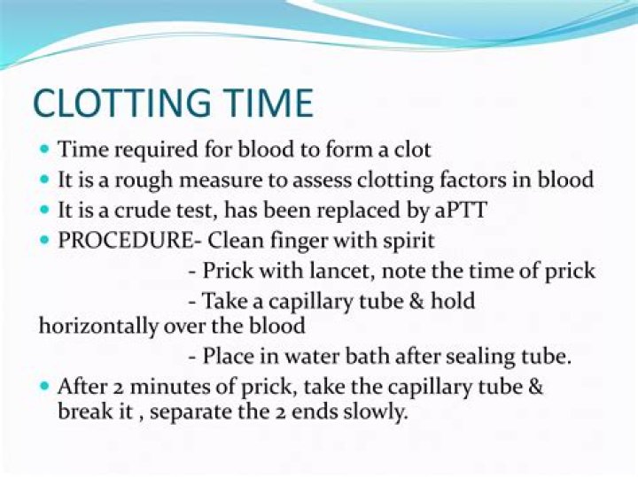 Normal value of clotting time is 2-8 minutes. For the measurement of clotting time by test tube method, blood is placed in a glass test tube and kept at 37° C. The required time is measured for the blood to clot.