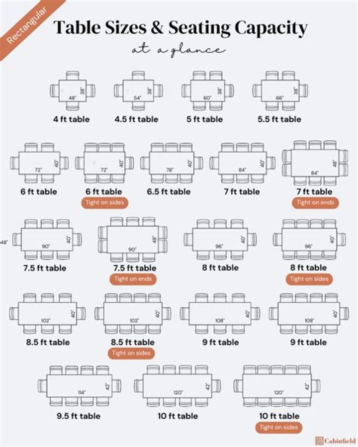 A standard, rectangular 10-person table measures 96-inches long.
