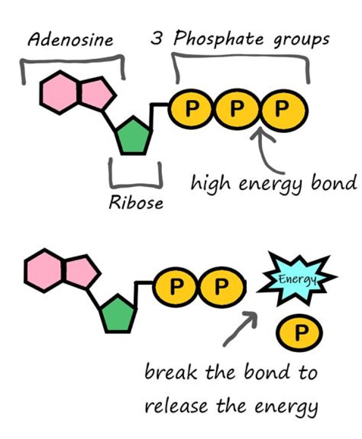 Think of it as the “energy currency” of the cell. If a cell needs to spend energy to accomplish a task, the ATP molecule splits off one of its three phosphates, becoming ADP (Adenosine di-phosphate) + phosphate.