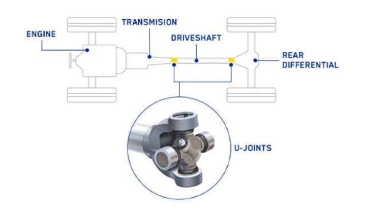 Rear-wheel-drive vehicles have universal joints (or U-joints) at both ends of the drive shaft. U-joints connect to yokes that also allow drive shafts to move fore and aft as vehicles go over bumps or dips in the road, which effectively shortens or lengthens the shaft.