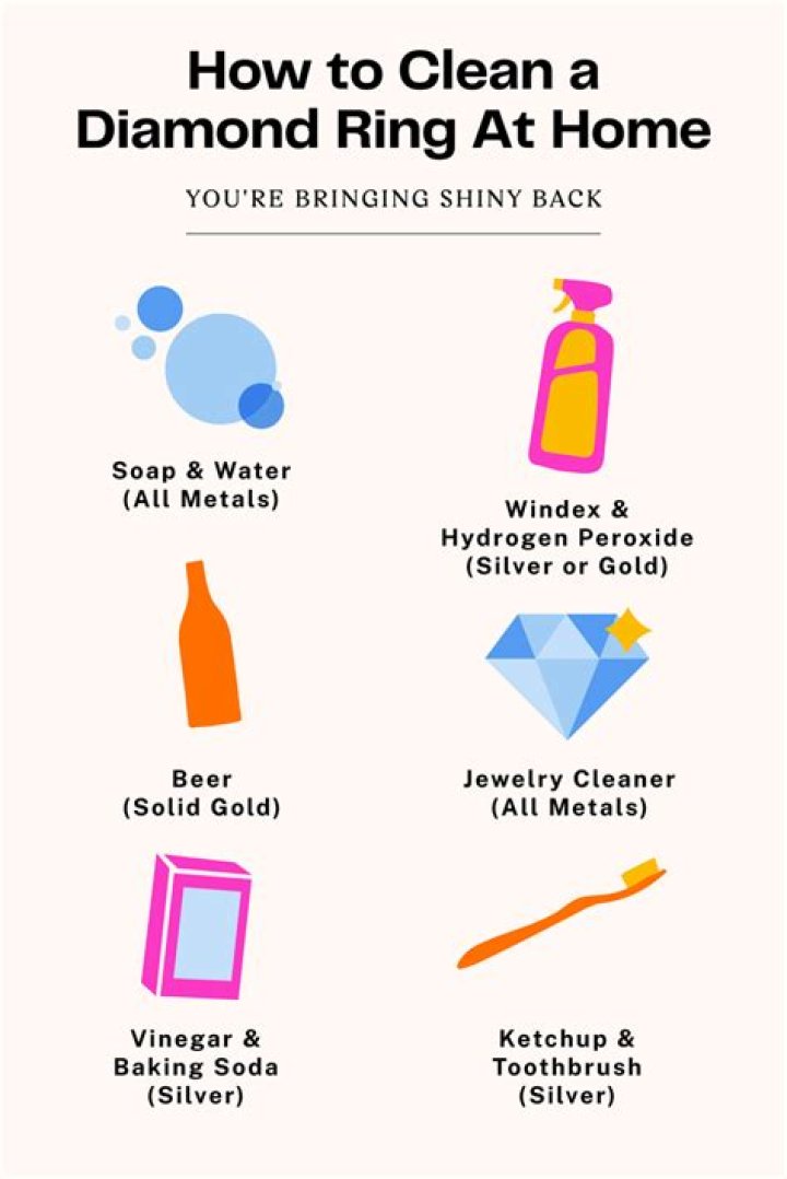 Fill a small container with warm water. Dissolve some detergent into the water, enough to make it slightly soapy. Soak your diamond ring in the mild detergent solution for five minutes. Prepare a second container, fill it with warm water, and add an ammonia-based glass cleaner.