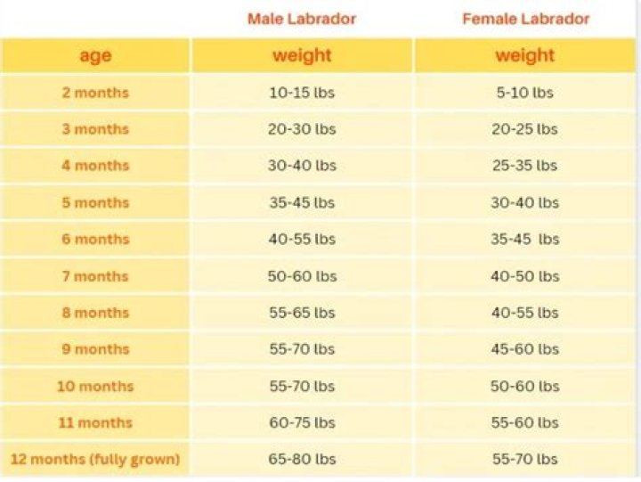 How much should my Labrador puppy weigh? Many ‘average’ Labrador puppies weigh just over two pounds for each week of age. So on the Labrador puppy growth chart at around three months such a puppy might weigh 25lbs, and at six months they’ll reach 50lbs.