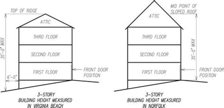 The height of a three-story home or building likely ranges between 33 and 40 feet.