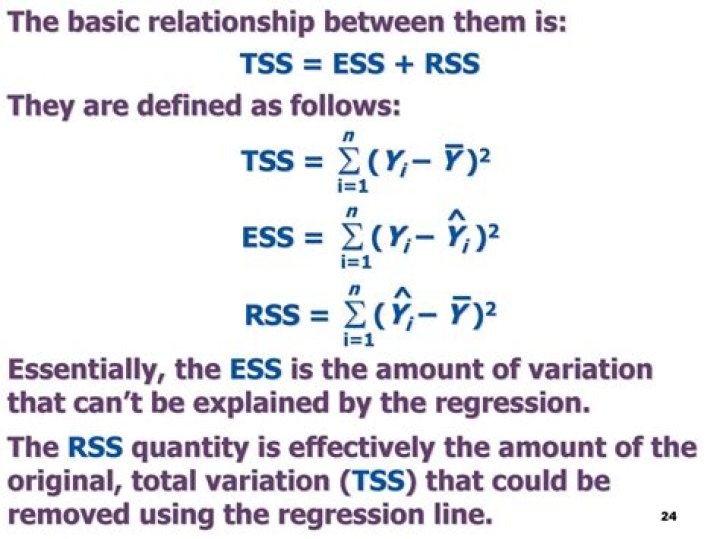 TSS = ESS + RSS, where TSS is Total Sum of Squares, ESS is Explained Sum of Squares and RSS is Residual Sum of Suqares.