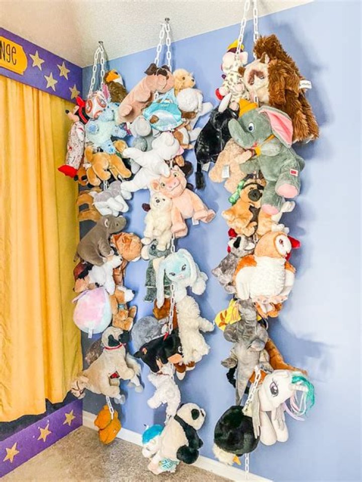 Hang the plastic chain on the hooks. Adjust the chain to the length of your liking.Clip the hooks onto the stuffed animals and hang on the chain. We did three vertical rows for the plush toy storage. Organize stuffed animals to your liking.