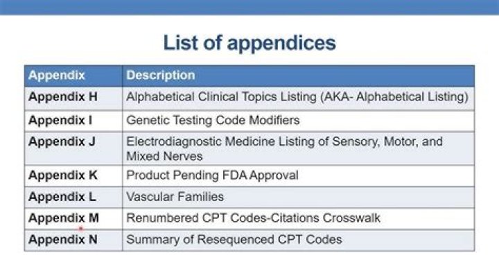 Appendix B – Summary of coding additions, deletions and revisions. Appendix N – Summary of Resequenced CPT Codes. Abbreviation key for medium descriptions. Appendix O – Listing of MAAA’s (Multianalyte Assays with Algorithmic Analyses)