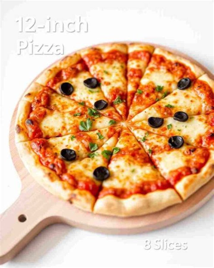 Pizza size generally varies between: Small Pizza: 8-10 inches with 6 slices. Medium Pizza: 12 inches with 8 slices. Large Pizza: 14 inch with 10 slices.
