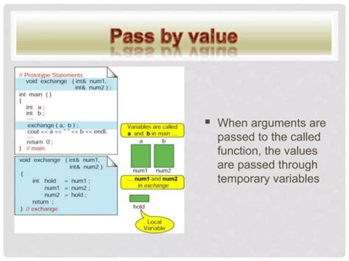 When you pass an argument by value, you pass a copy of the value in memory. The function operates on the copy. This means that when a function changes the value of an argument passed by value, the effect is local to that function; the copy changes but the original value in memory is not affected.