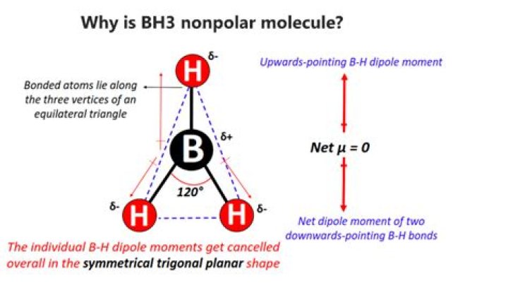 In tetra-atomic boron trihydride (BH3), the dipole moment is zero, but that of ammonia (NH3) is 1.49D. This is because BH3 has a symmetrical structure and the 3 B-H bonds are placed at an angle of 120 degrees to each other.