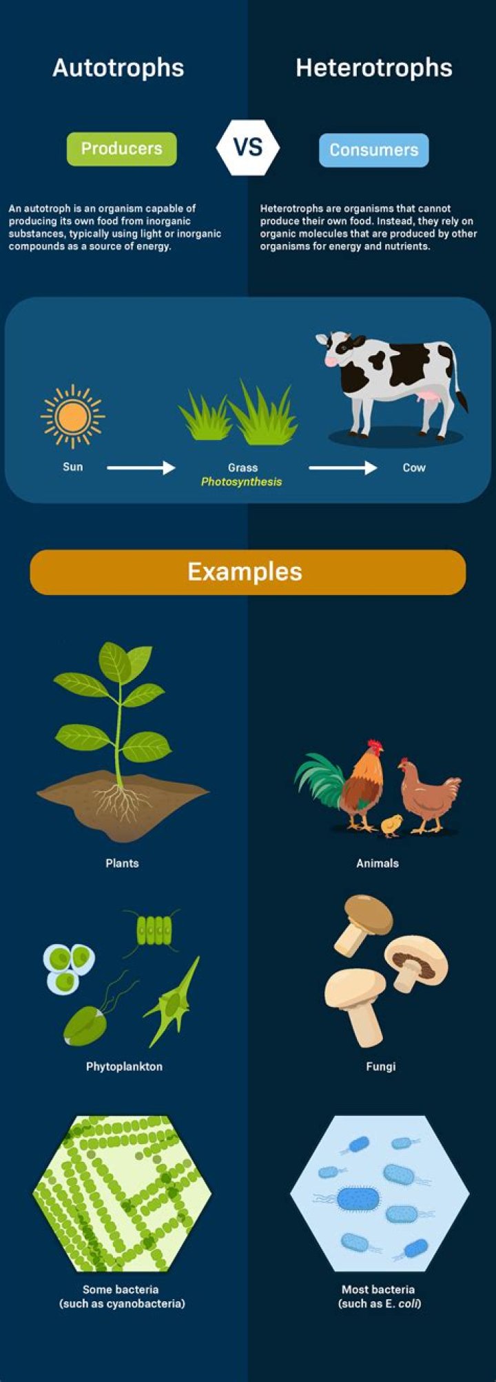 The grass is an autotroph that uses photosynthesis to transform sunlight into food. Through photosynthesis, the grass makes enough energy to survive and grow, and even makes a little extra to pass on. The cow, a heterotroph, eats the grass for fuel.