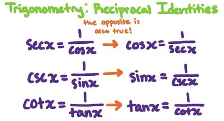 The reciprocal identities are: csc(x) = 1/sin(x), sec(x) = 1/cos(x), and cot(x) = 1/tan(x).