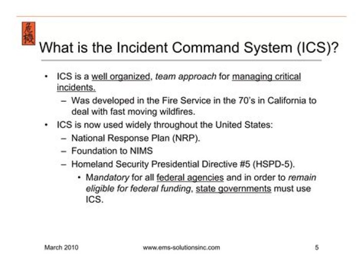 The Incident Command System (ICS) and NIMS are the same, and these terms can be used interchangeably. ICS is a standardized, on-scene, widely applicable approach to incident management.
