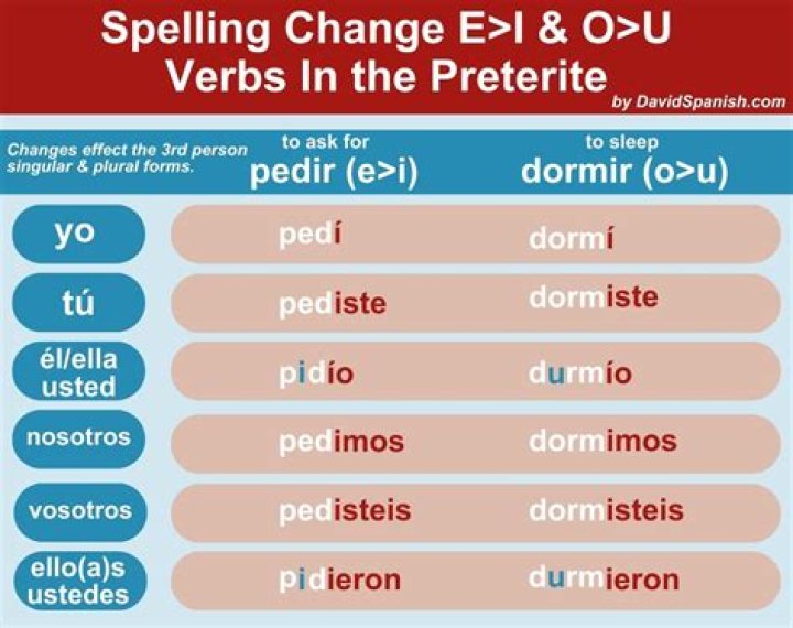 Table demonstrates the preterit patterns for morir (to die), an ‐ir verb that undergoes an o>ue stem change in the present tense. The verb dormir (to sleep) is conjugated in exactly the same manner. There are several ‐ir verbs that undergo an e>ie stem change in the present tense.