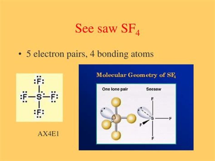 This shape is caused by a lone pair of electrons on the central atom. An example of a seesaw shaped molecule is sulfur tetrafluoride, or SF4. The equatorial plane fluorine atoms form an angle of 89 degrees, and the angle formed from the equatorial plane fluorine atoms to the axial plane fluorine atoms is 103 degrees.