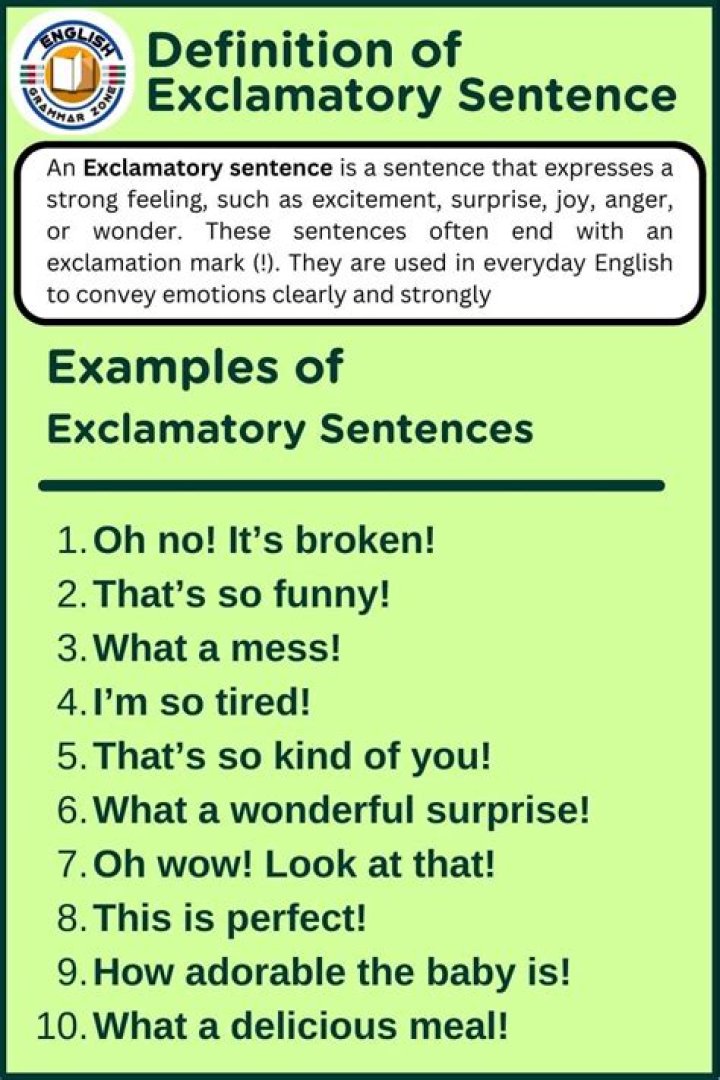 An exclamatory sentence, also known as an exclamation sentence or an exclamative clause, is a statement that expresses strong emotion. Typically, in English grammar, an exclamatory sentence ends with an exclamation mark鈥攁lso called an exclamation point.