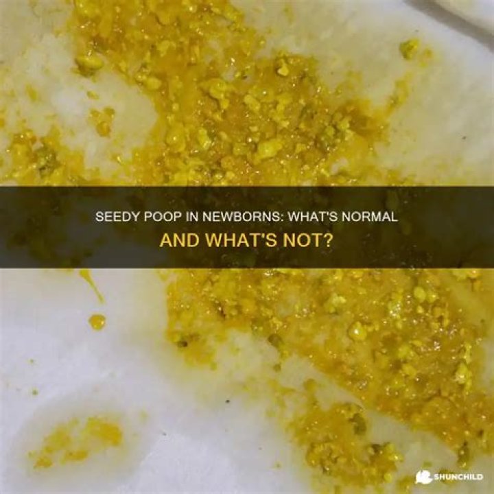 Yellow. and may have small flecks in it. These flecks come from breastmilk and are harmless. Poop from breastfed babies is often described as “seedy.” The so-called seeds may resemble curds in cottage cheese but are yellow.