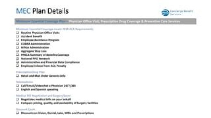 A Minimum Essential Coverage (MEC) plan offers ACA required wellness and preventive services, such as immunization and routine health screening only. This plan is in compliance with ACA rules and regulations, but it does not cover medical services or conditions caused by accident or illness.