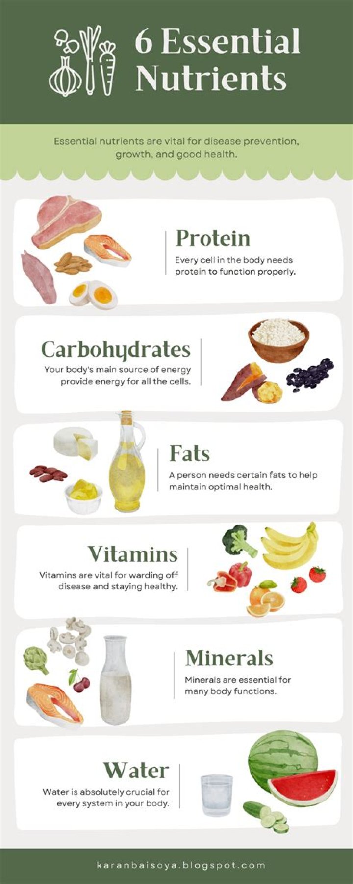 The six essential nutrients are vitamins, minerals, protein, fats, water, and carbohydrates.