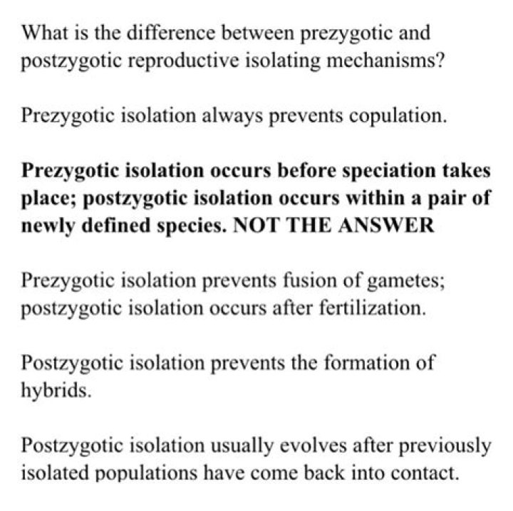 Prezygotic isolation prevents the fertilization of eggs while postzygotic isolation prevents the formation of fertile offspring. Prezygotic mechanisms include habitat isolation, mating seasons, “mechanical” isolation, gamete isolation and behavioral isolation. Those are okay, we got the sperm to the egg.
