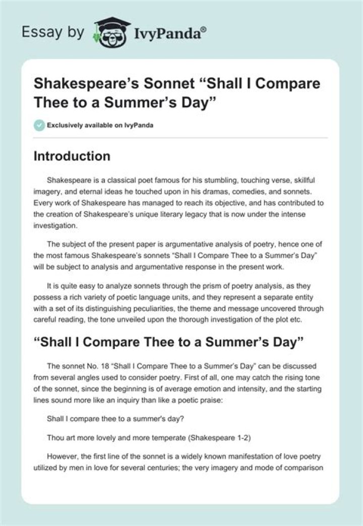 In Sonnet 18, Shakespeare compares the beloved’s beauty to a summer’s day by explaining how he’s livelier and warmer than summer and that, even though summer will eventually pass, the beloved’s beauty won’t ever fade, as the poem will celebrate it forever.